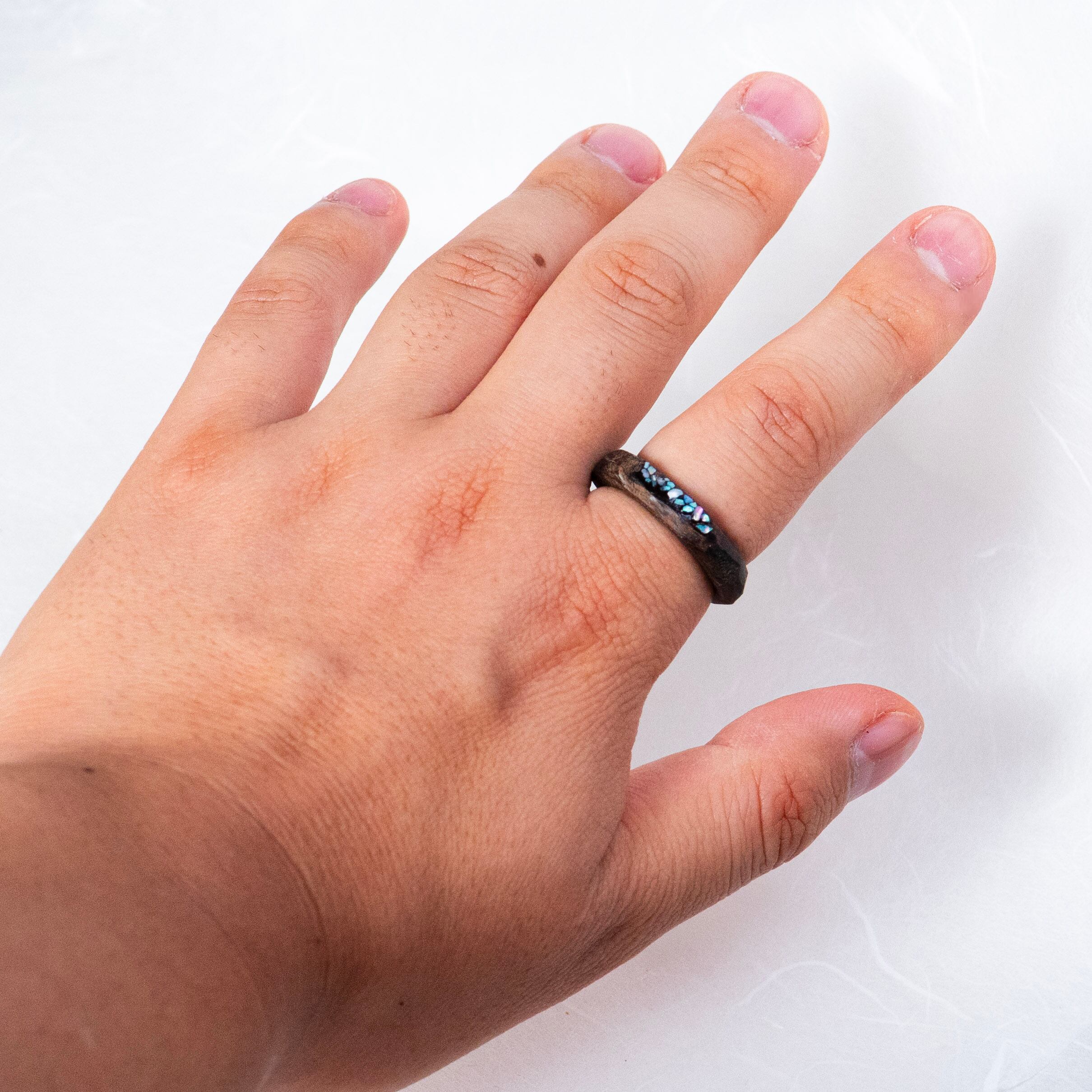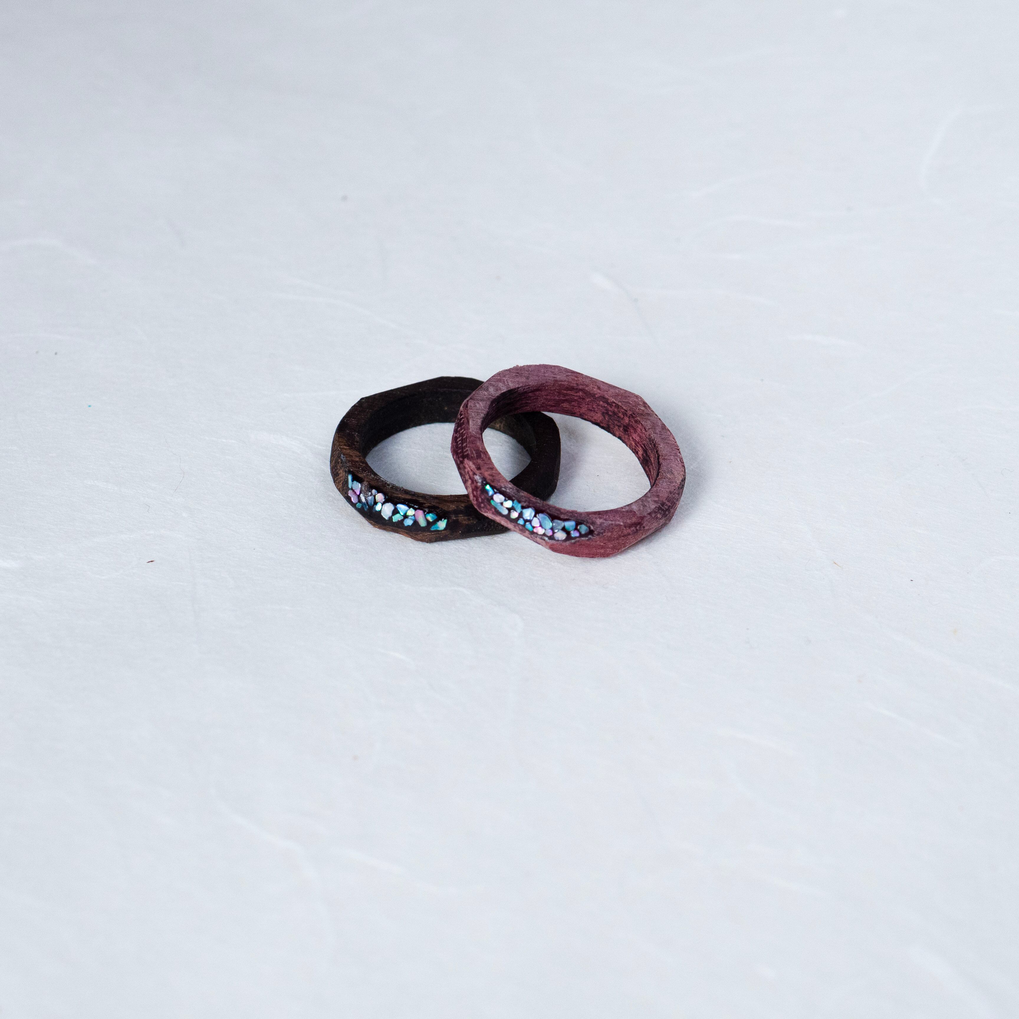 螺鈿細工の技法を用いつつ、木本来の色と木目を活かすために特別に仕上げた指輪です